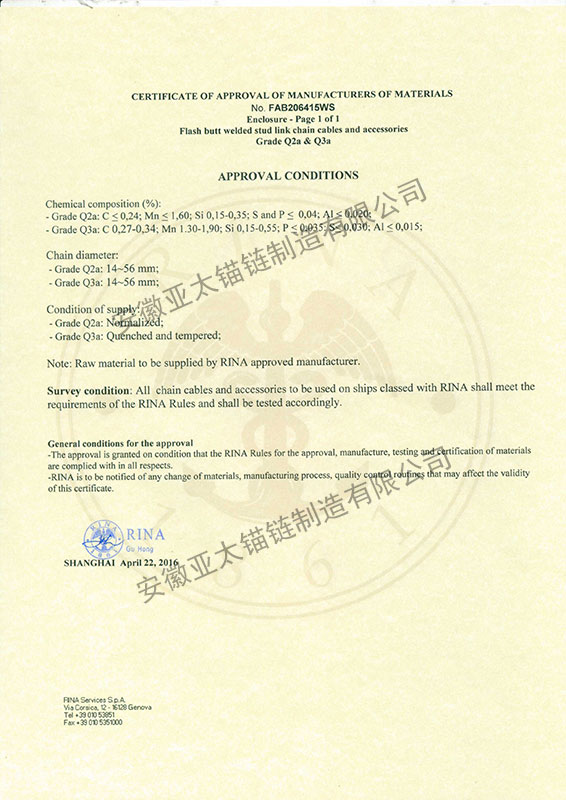 安徽亞太錨鏈制造有限公司是國家高新技術企業,也是國家GB/T 549-2017《電焊錨鏈》標準的起草和制定單位之一。公司旗下設有錨鏈分廠、浮標分廠、舾裝件分廠等多個分廠。公司專業從事φ12.5mm-φ107mm二、三級船用錨鏈、浮標錨鏈、錨鏈附件,錨、船舶曬裝產品、航標、系船浮、船型標、多種規格海洋監測浮標及航標燈等產品的生產、安裝和服務。目前公司的產品銷往全國各地船廠、碼頭、航標處、航道局、海洋局,并已走上國際市場,如東南亞、中東、歐美等國家。